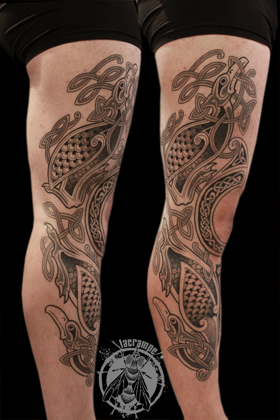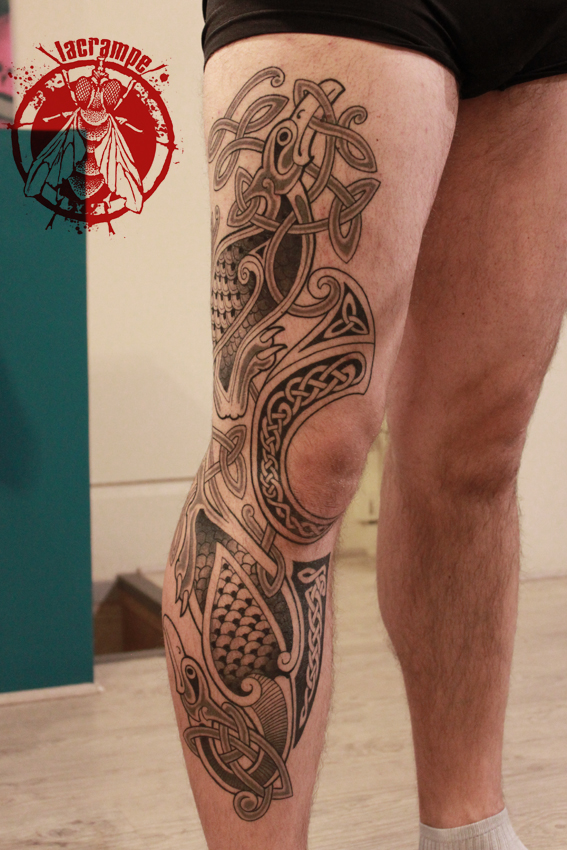 La jambe celte de Baptiste, encrée en 3 séances. Je faisais beaucoup de celtique en Bretagne, à mes débuts : une angoisse sans nom sur des petites pièces bourrées de détails. Les sueurs froides quand les transferts s’effaçaient, les lignes qui ne se rejoignaient pas sur les bracelets… Alors quand Baptiste m’a demandé du celtique j’ai appliqué ce que j’ai appris toutes ces années, notamment sur l’aération des pièces. Et j’ai pris du plaisir à le faire ce celtique !