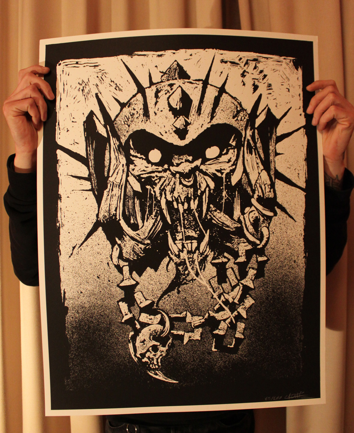 Mais sous l’histoire il y a une autre histoire… Je n’ai pas pour habitude d’étaler ma vie privée sur internet et ce n’est pas aujourd’hui que ça va commencer. Il suffit juste de savoir que ces deux derniers mois je les ai passé moi aussi en enfer. Et ce sont mes amis qui m’en ont sorti, amis à qui je dédicace donc ce portrait et en particulier à Dolu ! Drôle de coïncidence puisqu’il y a à peine moins d’un an je réalisais pour un autre de mes amis, Greg, une version à ma sauce du Warpig/Snaggletooth de Motörhead dont une sérigraphie a été tiré (100 exemplaire signés et numérotés) :