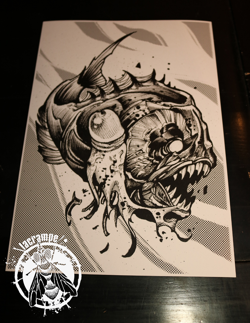Comme j’étais à court de carte de visite et à la bourre pour en faire imprimer, une fois n’est pas coutume, j’ai fait ce dessin la veille du départ et l’ai sorti sur photocopieuse (laser et papier épais…quand même !) le lendemain matin. Avec des tirages A4 en prime. Résultat visiblement personne n’a vu le rapport entre le visuel et la date, pire les gens n’ont pas capté le « truc »… le seul print qui est parti a été pris par une mère pour son fiston d’à peine 10 ans.