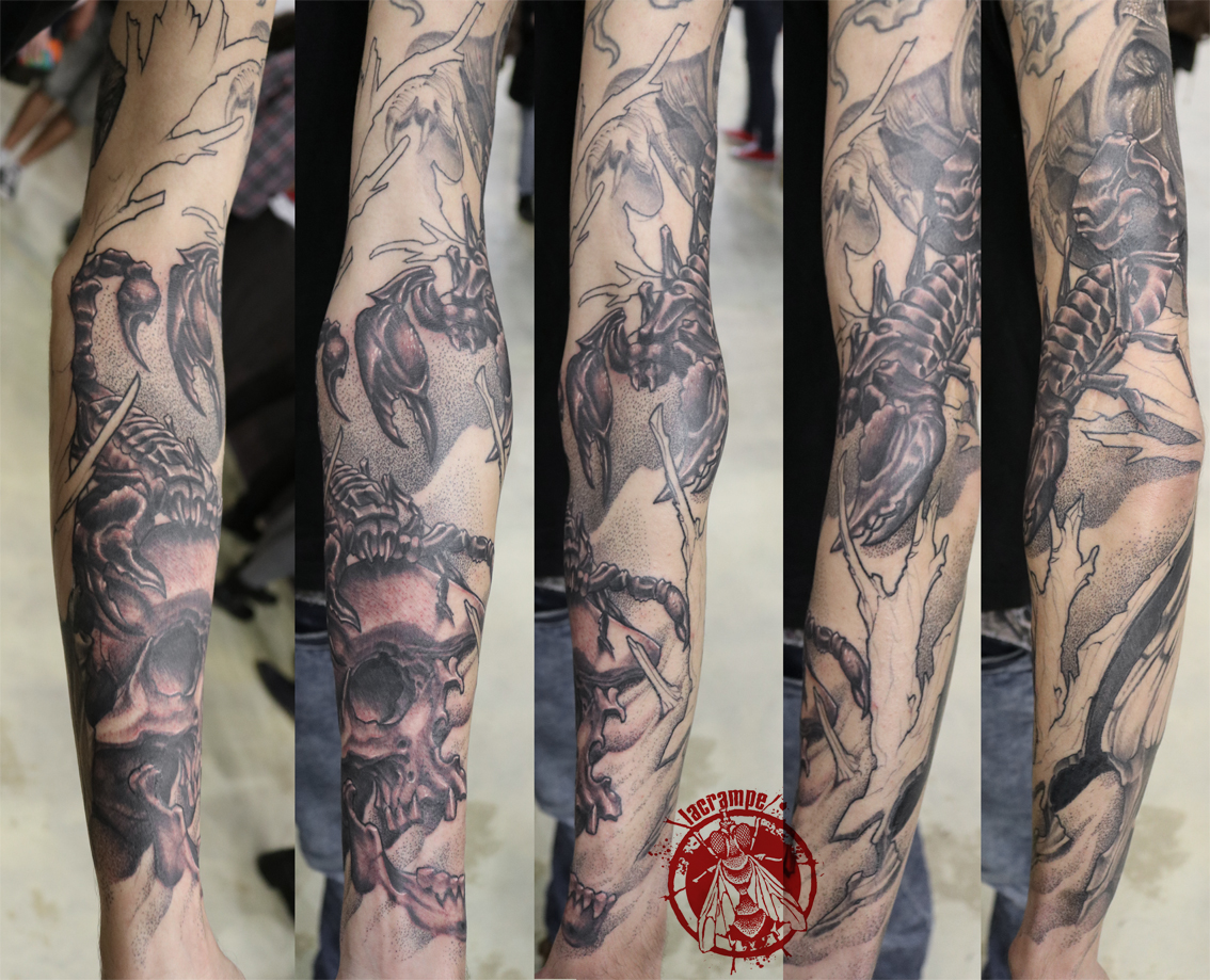 Le lendemain j’ai continué le bras de Marc qui habituellement se déplace à Clermont pour le faire et qui pour une fois à pu se faire encrer « à domicile » (Merci pour les canelés qui tuent et le superbe dessin de sa fille !) :