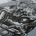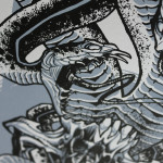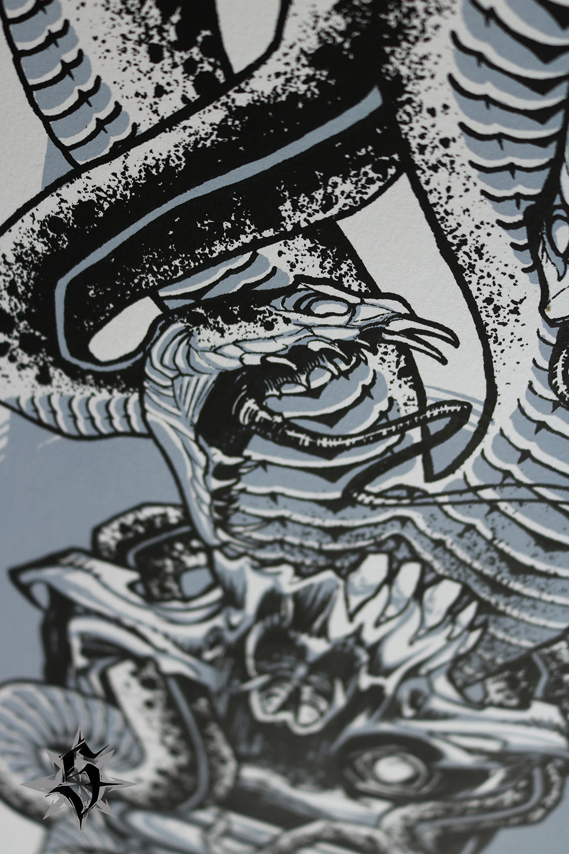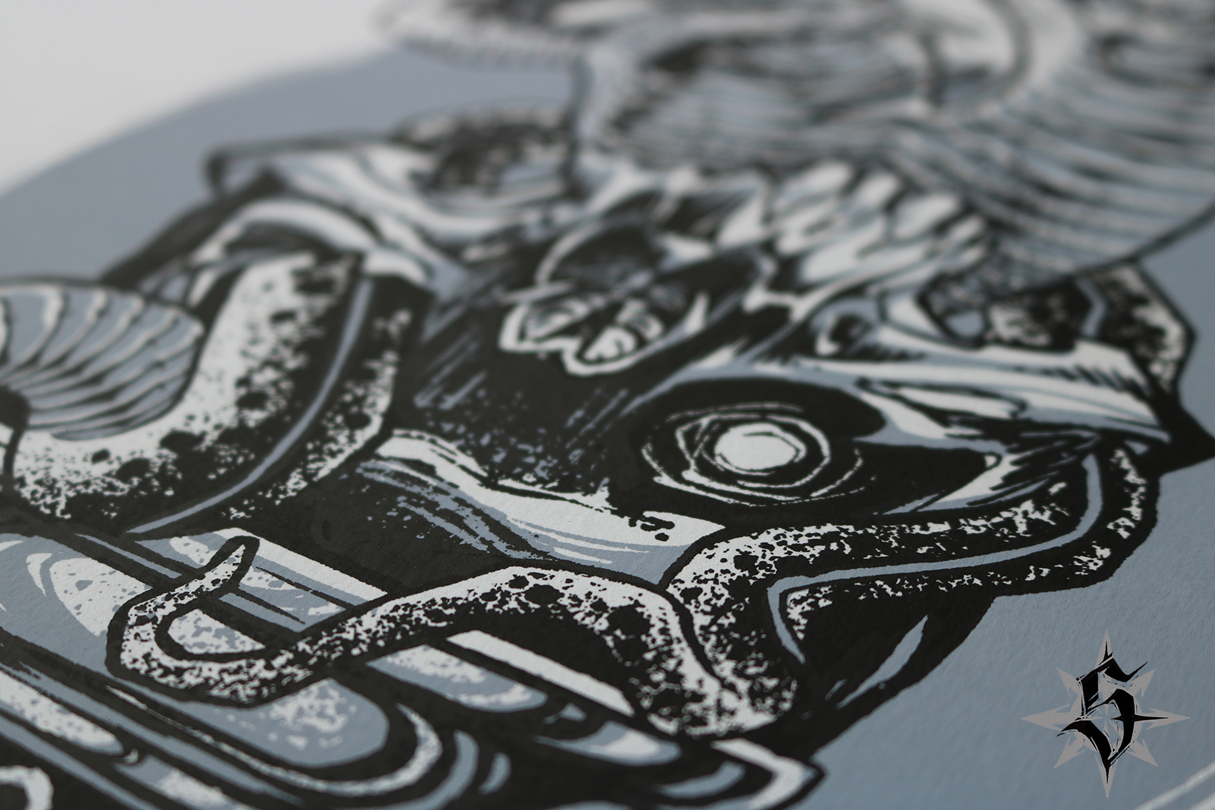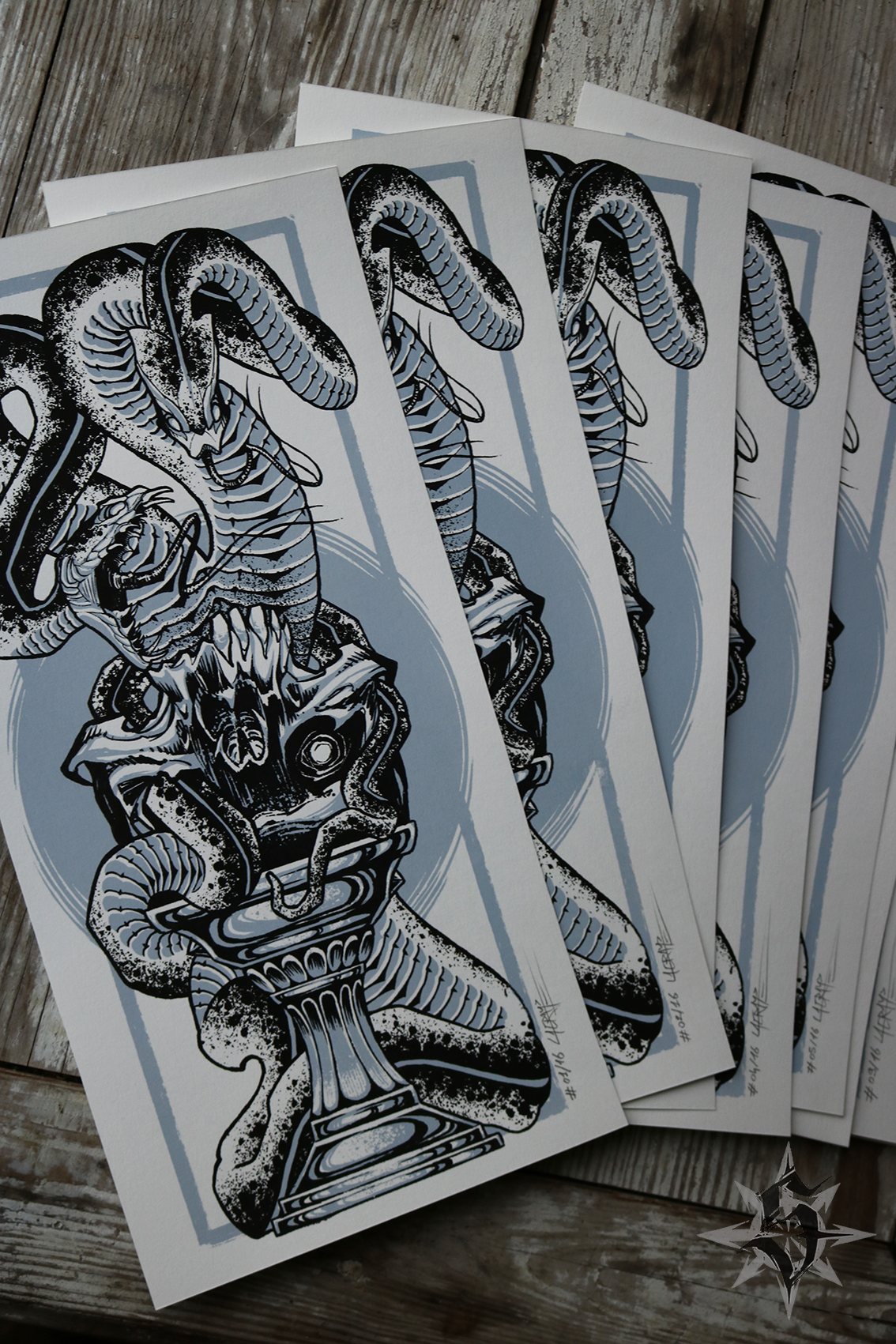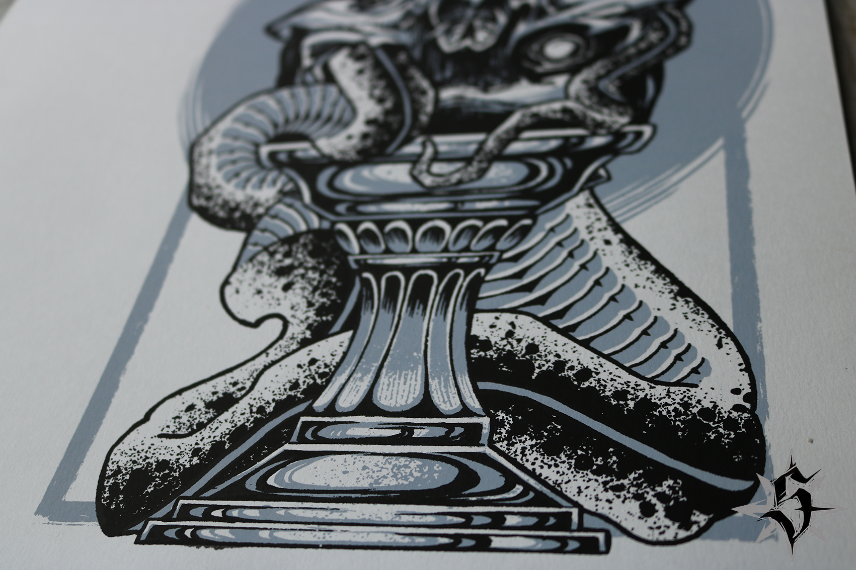 Depuis quelques mois j’apprends la sérigraphie auprès du copain David TAMAM . Celle ci, titrée « DEATH GRAAL », a été imprimée en octobre 2022 et m’a donné du fil à retordre ! Sur 50 tirages je n’en ai conservé que 16 qui étaient d’une qualité suffisante pour être vendables. Il y a aussi eu 8 exemplaires « hors-série » (des tirages avec des défauts que j’offre à mes potes). Aujourd’hui il n’en reste plus que 3 disponibles dans mon shop : https://arterror.bigcartel.com/ !!!