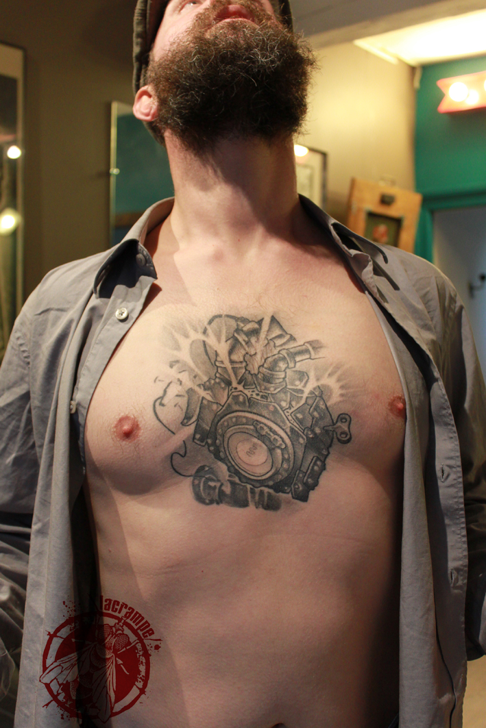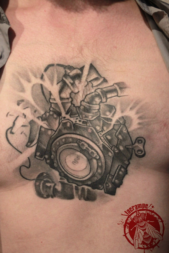 Le coeur déglingué de Pablo encré il y a quelques mois suite à l’expo qu’ils avaient posé à l’atelier avec « In Lino Veritas ». Un bon moment, un bon échange et, du moins je l’espère, un bon tattoo. C’est peu visible sur la photo mais je m’étais éclaté sur des textures de métal brossé et des contrastes forts.