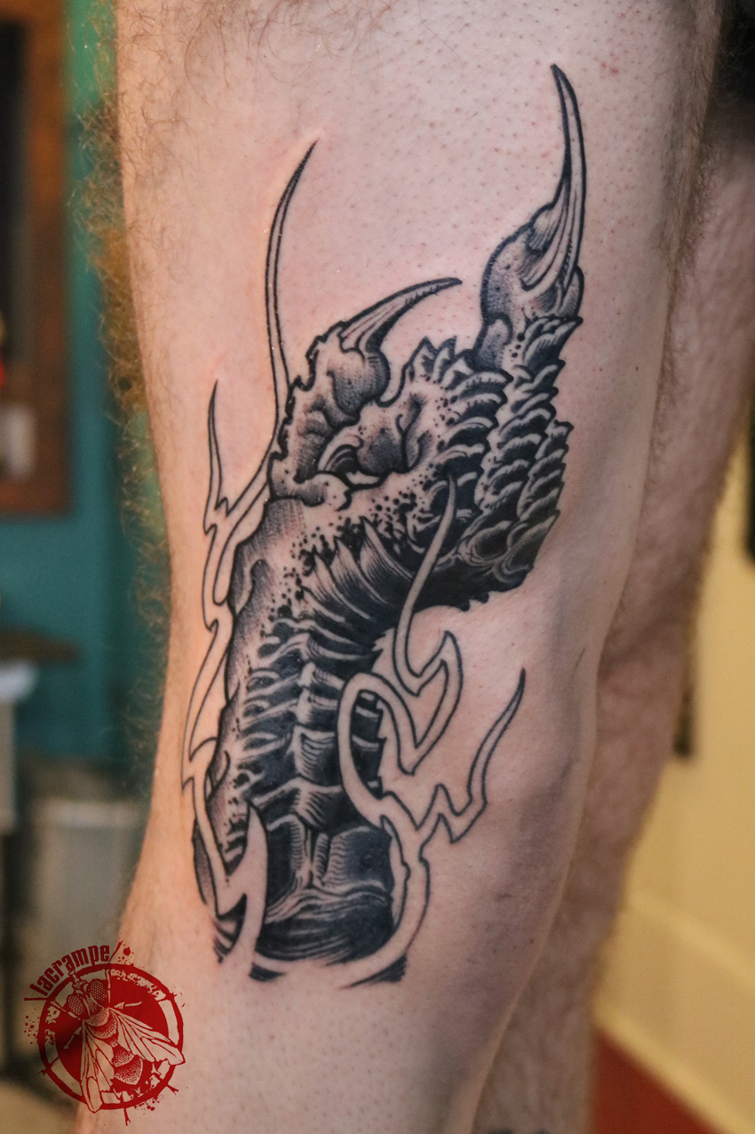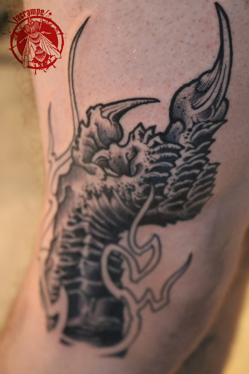Encré hier sur Josh en 2h30 et en Black Work… Dessin tiré d’un de mes flashs/occasions à saisir (j’ai modifié les flammes au dernier moment pour les rendre plus « nerveuses »).