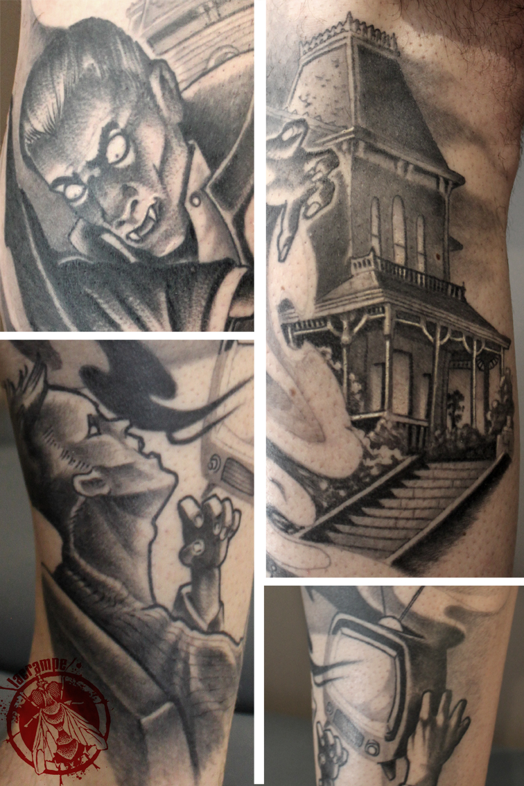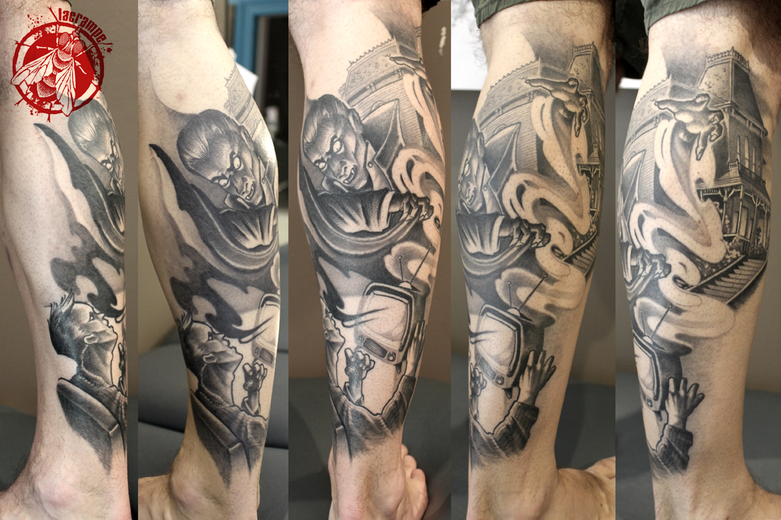 Le Mollet de Lénaïc qu’on a finit (en 3 séances) juste avant l’été. Un hommage aux films de la Hammer des années 50/60 qui lui ont fait faire de douces nuits blanches (les amateurs de films d’horreur comprendront). Le personnage de Bella Lugosi m’a servi de base pour le vampire même si vous ne trouverez pas forcément de ressemblance étant donné qu’on a choisit un traitement proche de la bd (avec en fond une inspiration venant encore du génial Bernie Wrightson). L’idée était d’avoir le suceur de sang « classe » de ces années là et on a rajouté un hommage supplémentaire avec le manoir Bates du « Psychose » d’A. Hitchcok traité en réalisme.