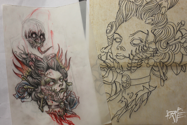 Et pour finir la semaine, une séance sur le bras de notre hôte… Pas de photo pour le moment, on attendra que ça soit finit, mais un avant goût avec le dessin/transfert de son avant bras.