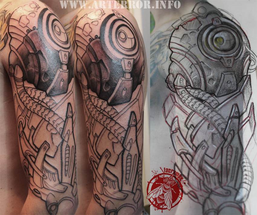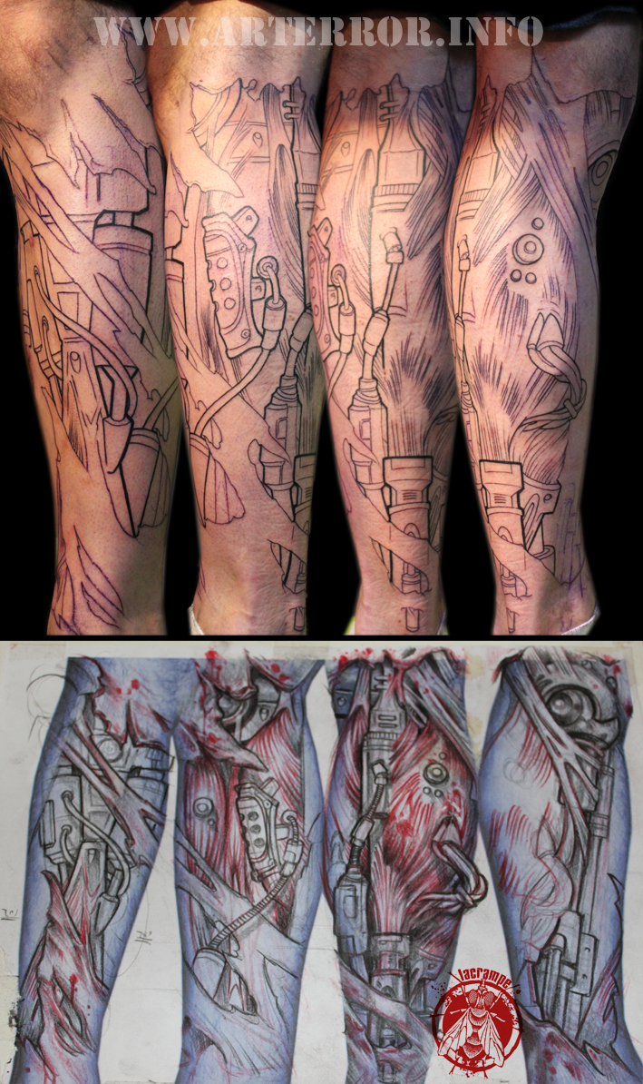 Première séance (sur 3 de prévues) pour le haut de bras de Fabien qui porte déjà un crâne cyborg. La suite sera en noir et gris avec effets de lumière jaunes comme sur le dit crâne…