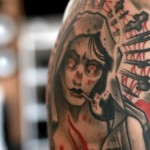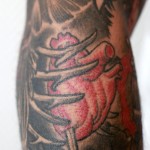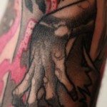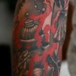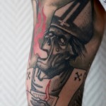Il est des projets qui comptent plus que d’autres, celui de « Six the ripeur » tient une place particulière. D’abord par sa thématique antireligieuse.  En bon mécréant antithéiste j’exècre profondément les catholiques, même si chacune de ces sectes à réussite variable qu’on appelle religion me fait vomir.  Ensuite parce qu’il a été réalisé sur mes passages en guest chez mon pote Chris Leblanc en Normandie à Argentan et que chaque session a été l’occasion de se marrer comme des bossus. Et enfin parce que j’ai un profond respect pour le porteur, je trouve étrange pour ne pas dire putassier cette habitude qu’on les tatoueurs d’aujourd’hui de remercier leurs clients d’être venu se faire tanquer chez eux, habitude que j’assimile à un pompage hypocrite en règle mais là je ferais une unique exception, merci à lui pour ce projet et sa confiance.