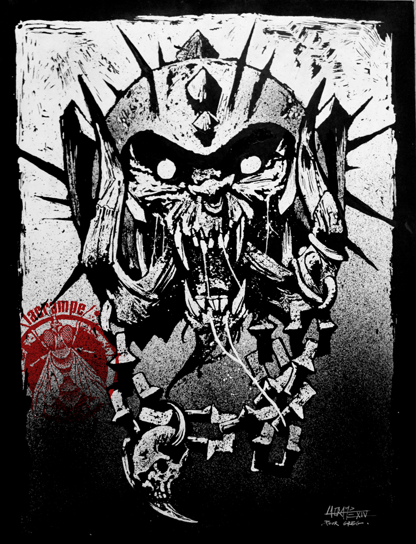 Un « chainsaw art » réalisé en fin d’année dernière pour mon pote Greg, le « War Pig » ou « Snaggletooth » de Mothorhead. Prévu en sérigraphie pour ce début d’année.